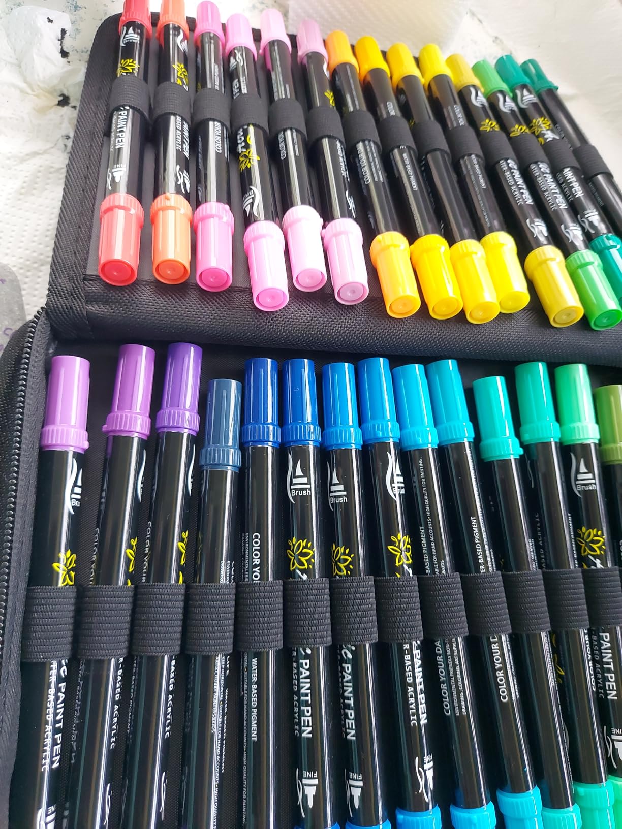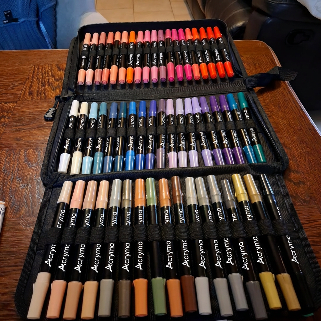 Die ACRYMA™ Stifte hingegen enthalten flüssige Acrylfarbe: Sie tragen eine deckende, intensive Farbschicht auf, die nicht durch das Papier drückt.