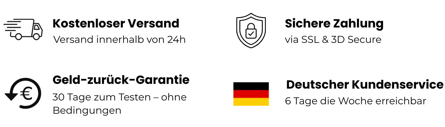 Nutzen Sie unsere 30-Tage-Zufrieden-oder-Geld-zurück-Garantie: Wenn Sie nicht überzeugt sind, erhalten Sie eine vollständige Rückerstattung.